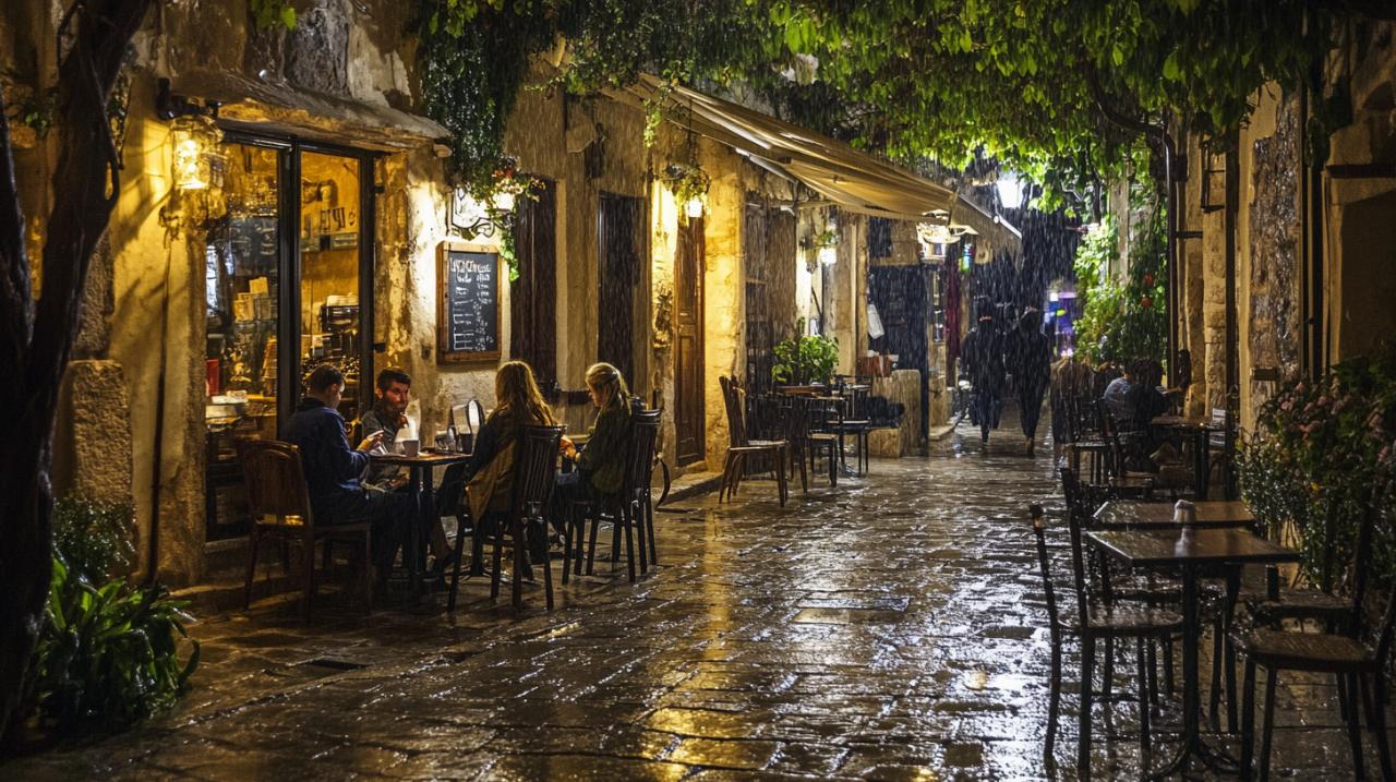 Para quienes prefieren disfrutar de la cocina cretense sin ponerse el delantal, las tabernas tradicionales de la isla representan el refugio perfecto en días lluviosos. Estos establecimientos, muchos de ellos con décadas o incluso siglos de historia familiar, ofrecen un ambiente cálido y acogedor donde el tiempo transcurre al ritmo de las conversaciones pausadas y las comidas generosas. El sonido de la lluvia sobre los tejados de teja añade una banda sonora perfecta a la degustación de platos como el stifado, ese guiso lento de carne con cebolla y vino tinto que reconforta cuerpo y espíritu, o los deliciosos mezze que permiten probar múltiples sabores en pequeñas porciones. Las tabernas cretenses suelen decorarse con elementos rústicos, fotografías antiguas y detalles que cuentan historias de generaciones anteriores. El servicio, frecuentemente a cargo de los mismos propietarios, se caracteriza por su calidez y hospitalidad genuina. Acompañar estas comidas con vino cretense, producido en viñedos que han resistido invasiones, terremotos y el paso implacable de los siglos, completa una experiencia que alimenta tanto el cuerpo como el alma. Muchas tabernas se encuentran en callejuelas empedradas del casco antiguo de ciudades como Chania o Rethymno, donde el paseo bajo paraguas entre casas venecianas añade encanto adicional a la jornada gastronómica.